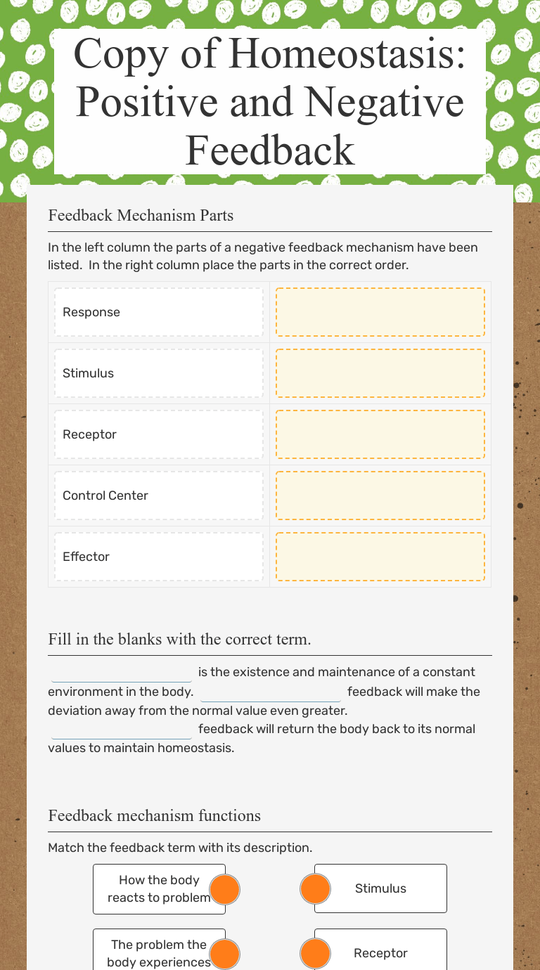 Worksheets are homeostasis and feedback work, homeostasis work, homeostasis. Give an example of a negative feedback mechanism that helps to. Describe the difference between positive and negative feedback mechanisms. Each group should be given a feedback mechanism (see examples below). Groups will research their feedback mechanism through the use of.