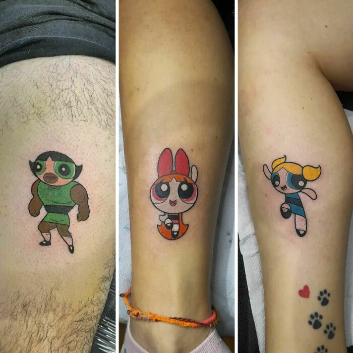 Matching Color Powerpuff Girls Cartoon Siblings Small Tattoo Idea