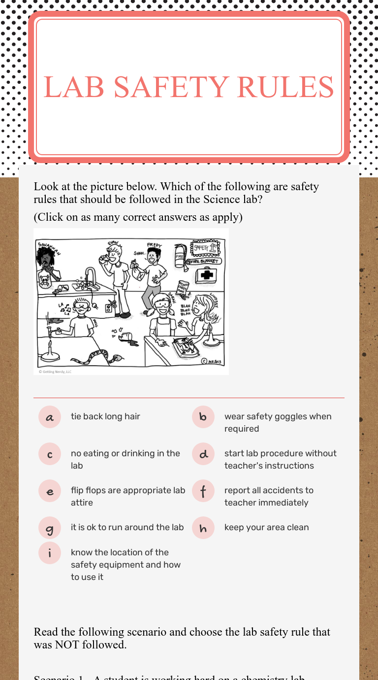 In these materials, you’ll find a series of 6 scenarios depicting behaviors that could occur in a school laboratory setting. The purpose of general laboratory safety rules is to protect the health and safety of laboratory users. Because of this, we have prepared various lab. Lab classes present unique challenges and opportunities. This worksheet can help students understand safe lab.
